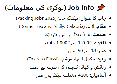 Packing Jobs in Italy 2025: Italy is opening thousands of packing jobs in 2025 under the Decreto Flussi visa program. These positions in food factories and warehouses offer full visa sponsorship, free accommodation, and meals. No experience or high education is required — only Matric and good health. Many companies are already hiring workers from Pakistan and the Middle East for immediate start. Full company contacts and step-by-step application details are below.