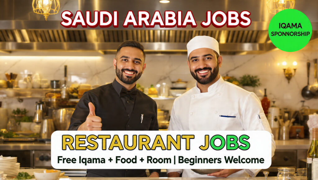 Restaurant jobs in Saudi Arabia are in huge demand in 2025 with Vision 2030 expanding the food service industry. Leading chains are urgently hiring Waiters, Cashiers, Kitchen Helpers, Cleaners, and Cooks across major cities. These restaurant jobs in Saudi Arabia come with 100% Iqama sponsorship, free shared accommodation, 3 meals daily, medical insurance, and annual return ticket. Immediate joining available for candidates from Pakistan, India, Bangladesh, Nepal, and Egypt.